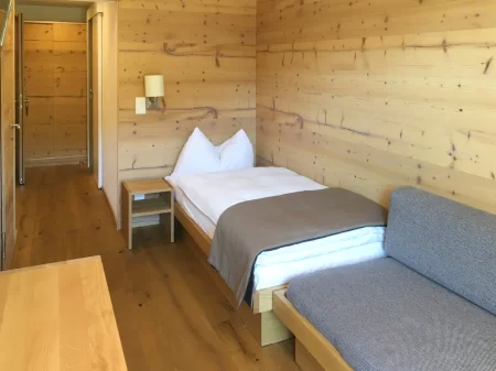 mit einer Dusche/WC ausgestattet und verfügt über ein Bett (200x90 cm), einen Schreibtisch, einen TV, einen Safe sowie einen Haartrockner. Eine Sitzecke mit einem Sofa (180x180 cm à 180x80cm, kann auf Wunsch in ein Extrabett umgewandelt werden) bietet zusätzlichen Komfort. Durch eine Verbindungstür gelangst Du zum Doppelzimmer Standard zur Ostseite, was dieses Arrangement besonders gut für zwei Erwachsene und zwei Kinder nutzbar macht.