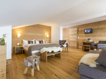 mit Bad/WC, einer separaten Dusche, einem Doppelbett aus zwei Einzelbetten (200x90 cm), einer Sitzecke mit Sofa (kann als Bett 200x140 cm genutzt werden), einem Schreibtisch, TV, Safe und Haartrockner ausgestattet. Sie eignet sich auch ideal als Familienzimmer für die Eltern mit zwei Kinder bis 12 Jahre oder als Dreibettzimmer für 3 Erwachsene. Eine Verbindungstür zum Doppelzimmer Superior zur Südseite ermöglicht eine Nutzung für Familien mit bis zu 4 Kindern.